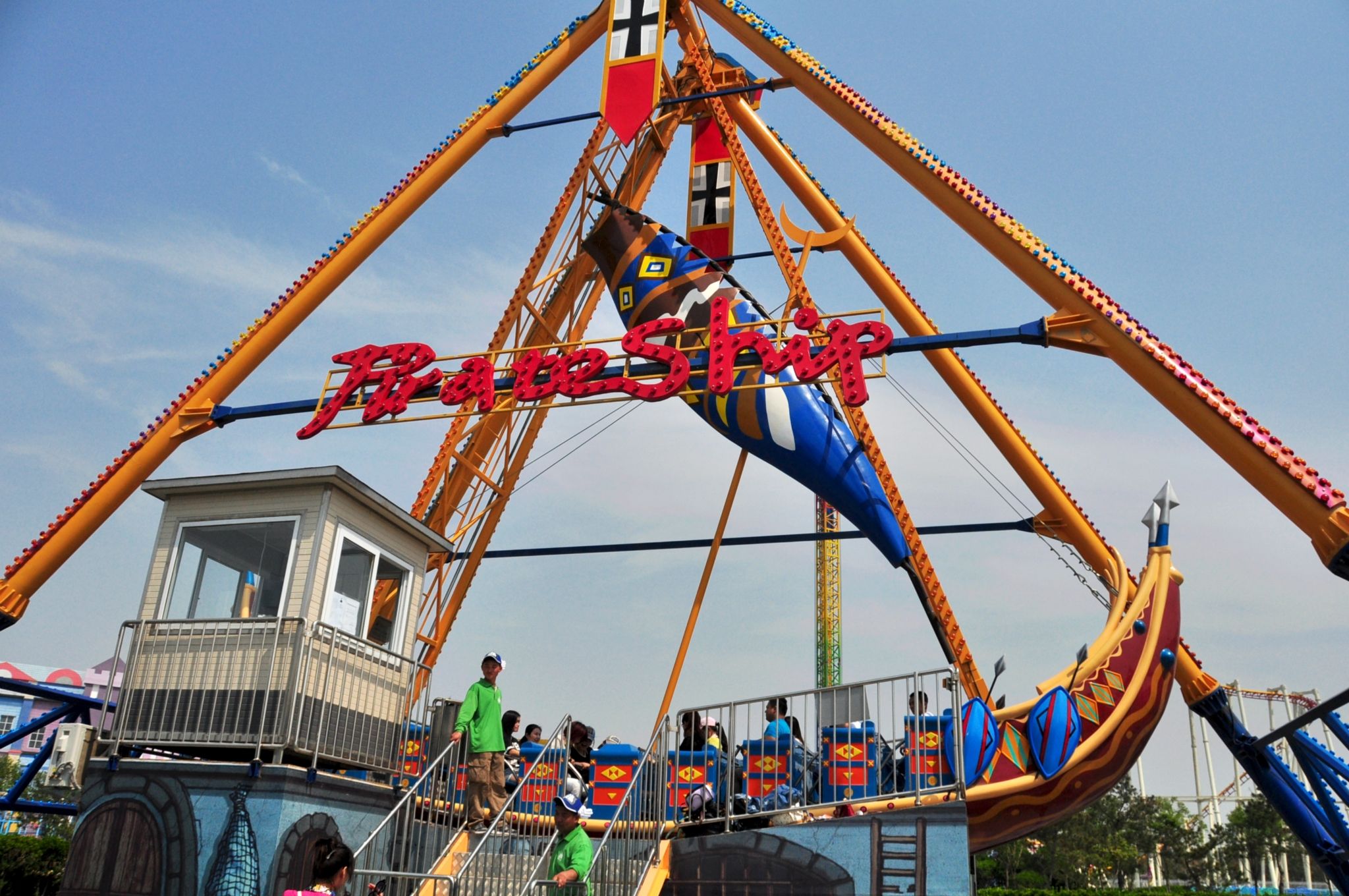 2、樂園內(nèi)還有很多常規(guī)的娛樂項(xiàng)目,比如大擺錘、激流勇進(jìn)等,以及更適合孩子的超豪華轉(zhuǎn)馬、旋轉(zhuǎn)飛椅、桑巴氣球、海盜船、碰碰車等項(xiàng)目,這里還有5D球幕飛行影院,你可坐在離地15米的座椅上,就像坐上滑翔機(jī)一樣,體驗(yàn)身臨其境地凌空飛行、俯瞰世界各地的美麗風(fēng)光;