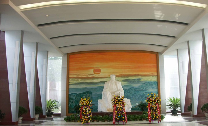 進(jìn)門(mén)是一寬敞大廳,廳前,一尊高2.67米、重達(dá)3噸多的毛澤東塑像立于紅帳之前,毛澤東身著風(fēng)衣,左手捏軍帽,右手前揮。 沿著一條開(kāi)滿鮮花的走廊,走近序廳,廳內(nèi)依次陳列了全國(guó)六大革命紀(jì)念地的圖片,即韶山、毛澤東故居、上海一大會(huì)址、黃洋界、遵義會(huì)議舊址,延安、天安門(mén),向人們展示了中國(guó)革命的歷史進(jìn)程。 序廳中央,展示了一座韶山山水模型,將韶山210平方公里濃縮于此中,出序廳,上臺(tái)階,過(guò)假山,沿回廊來(lái)到會(huì)客室,會(huì)客廳靠墻豎立著一尊巨型毛澤東銅像。版權(quán)所有山東聊城聊之旅國(guó)際旅行社有限公司,轉(zhuǎn)載必究!再往東通往樓上,三個(gè)院落呈品字形排列,在中庭的對(duì)角,各有2個(gè)小院,南院是一處臺(tái)地,與下棟參差錯(cuò)落,這兒光線較暗,為紀(jì)念館內(nèi)兩處藏寶之地:毛澤東遺物展和中南海故居。