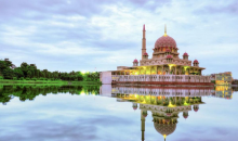 粉紅清真寺(Masjid Putra),仿造摩洛哥卡薩布蘭卡的哈桑清真寺而建,坐落在馬來西亞的新行政中心——太子城(Putrajaya,官方譯名:布城),占地面積5.5公頃,耗資1000萬美元,是馬來西亞最大的清真寺,同時也是東南亞地區(qū)最大的水上清真寺。