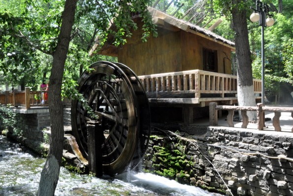 水磨河從龍口泉一直蜿蜒流淌到景區(qū)大門,河水清澈,兩岸綠樹成蔭,是整個水磨溝景區(qū)最靈動的部分。在靠近龍口泉的河邊,有座水磨坊,這是一座再現(xiàn)歷史景觀的仿古磨坊。據(jù)說,清乾隆年間,當(dāng)?shù)毓俜胶兔耖g曾利用水磨溝的水力,在這里置辦水磨坊一百多間,為駐軍和居民加工食糧,水磨河和水磨溝也正因此得名,后來,隨著磨制工具的更新,原有的水磨坊逐漸絕跡?,F(xiàn)在看到的這座磨坊是1992年的仿古建筑。