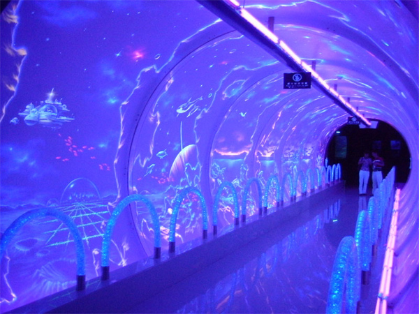 國內(nèi)絕無僅有的熒光純手工壁畫,由日本著名熒光畫大師遠山先生花了3個多月畫成,價值超三百萬元。整個壁畫描述了海洋形成、發(fā)展過程和未來的遐想,即海洋的昨天、今天和未來,在這里你可以完全放飛你的想象;該壁畫另一奇妙之處:如果關閉熒光燈,壁畫會變成一面白墻,什么也不見,但是打開熒光燈后,畫面栩栩如生,層次分明,你不得不驚嘆大師的高超技藝。