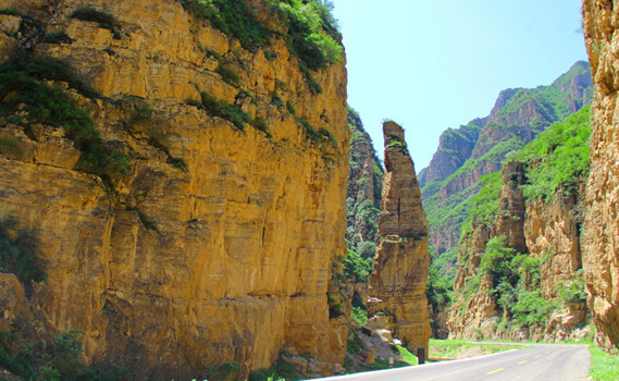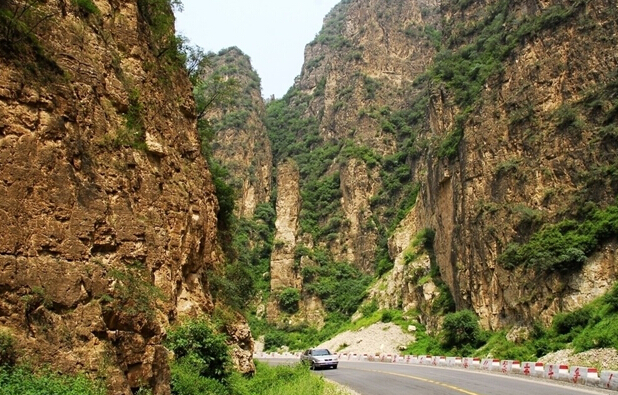《遼史·地理志》載:“相傳有狐于嶺,食五粒松子,遂成飛狐,故此處地名飛狐口”。這當(dāng)然只是一個(gè)傳說。順盤山公路蜿蜒而行,山石聳立,斧劈刀斷一般,四十里飛狐峪幾乎步步都有看點(diǎn),隨處可見喀斯特地貌造就的怪石異峰?!耙混南恪惫铝⒍?,傳說中楊六郎為爭(zhēng)國(guó)土箭射山峰留下的“箭眼”依稀可見。明崇禎時(shí)大學(xué)士、兵部尚書楊嗣昌在《飛狐口記》中稱“千夫拔劍,露立星攢”、“有如天門”、“回合萬(wàn)變”。清人吳蘗昌在《北口峪》中稱其山峰造化神奇,“疑神疑鬼,為人力當(dāng)不受”。飛狐峪最寬處只有七八十米,最窄處僅一米左右,頭頂只見一線天,堪稱“一夫當(dāng)關(guān),萬(wàn)夫莫開”。