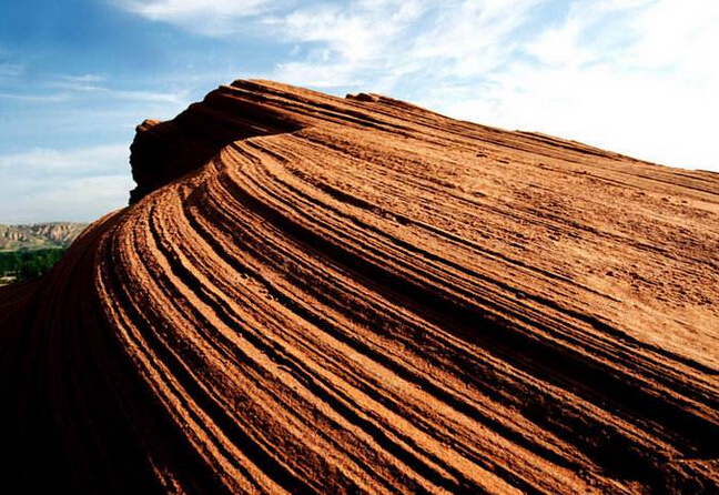 龍洲的紅砂巖被厚重的黃土所覆蓋,經(jīng)過數(shù)千萬年的風(fēng)蝕和水蝕,顯露出孤立的山峰和形態(tài)各異的奇巖怪石。其中以波浪谷最為著名,波浪谷展示的是由數(shù)百萬年的風(fēng)、水與時(shí)間交織,雕琢砂巖而成的奇妙世界。波浪谷巖石的復(fù)雜層面,是由一億五千萬年前侏羅紀(jì)就開始沉積的巨大沙丘組成,沙丘被一層層浸漬了地下水的紅沙所覆蓋,天長日久,水中的礦物質(zhì)把沙凝結(jié)成了砂巖,形成了層疊狀的結(jié)構(gòu),正如時(shí)光在靖邊大地上留下的指紋。