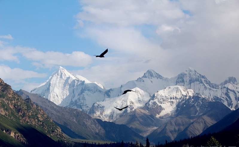 冰川形成于數(shù)萬年的地質(zhì)運(yùn)動(dòng),冰谷兩側(cè)的山峰的脫落,在冰川上覆蓋了一層石塊,正面凝望,巨大的冰川宛若一條褐色的巨龍,從潔白如玉的雪山上傾瀉奔下。木扎爾特冰川是很少有人涉足的冰川,由于冰塊的擠壓運(yùn)動(dòng),在裂縫交錯(cuò)的冰川上隆起了小山似的冰塔,冰川的融化,在不到2公里寬的冰川上沖出了很多條既寬又深的冰溝,溝底咆哮的冰河震耳欲聾,令人頓感懾魂奪魄。