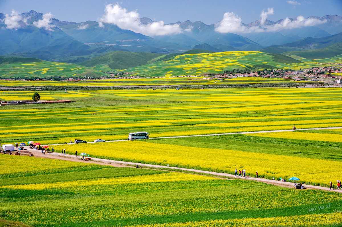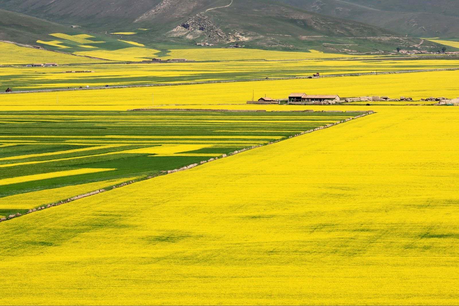 浩門河在中間流淌,這種景色就像鑲了兩道金邊的銀絲帶蜿蜒飄舞,與祁連山遙相輝映。在高原上常見的藍(lán)天白云襯托下,一望無際的金黃顯得異常斑斕,令人慨嘆,大色塊的簡單構(gòu)圖給人豐富的遐想。喜歡油菜花的人都是喜歡那種強(qiáng)烈的色彩,喜歡那種撲面而來的恢宏氣勢(shì)。常言道:常在花間走,能活九十九。當(dāng)人步入花的世界,花迎花送,伴君千里?;ㄏ闱呷诵钠ⅲ^之聞之似能解人苦樂,仿佛在輕輕訴說,猶如在歡愉地歌唱,恰似在喚起美好的回憶,又好像在安撫煩亂的思緒。踏青賞花,能領(lǐng)略到大自然的美,確屬快事一樁!下面,請(qǐng)大家觀賞一下咱門源的油菜花吧,它的那份壯觀在國內(nèi)其它地方確實(shí)是少有的。