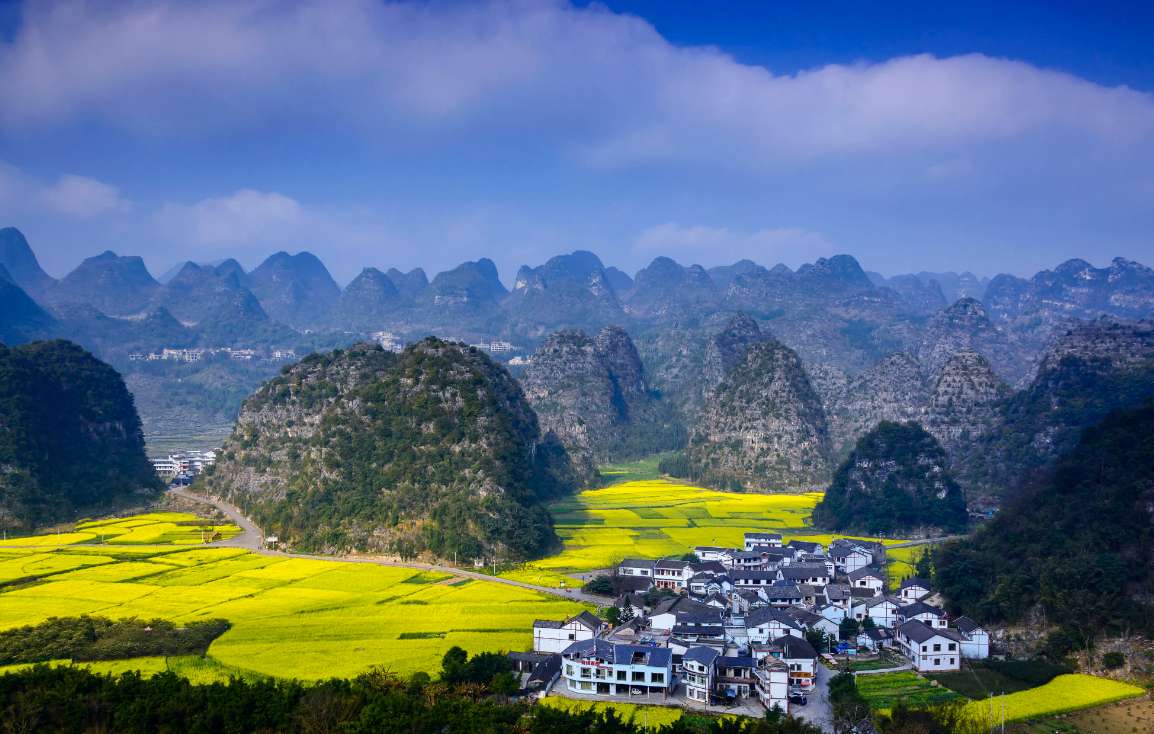萬畝油菜花:萬畝油菜花盛開在烈烈暖陽下,在層疊的峰林間,一座座峰林在初春的日光下延伸到天邊。山下是燦爛明黃的大海般的油菜花田,不知名的村寨掩映其中若隱若現(xiàn)。遠(yuǎn)處青山如黛,近處大片大片的油菜花開得熱烈燦爛。