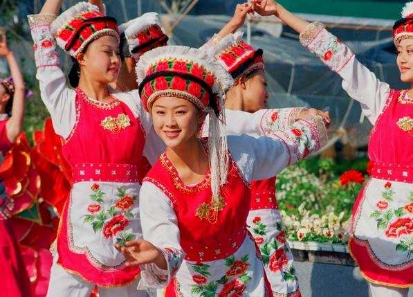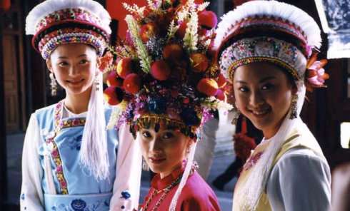 女子腰身苗條、婀娜,衣著色彩鮮艷、明快又大方。尤其是她們的繡花包頭,體現(xiàn)了大理的“風(fēng)花雪月” 四景??矗瑥潖澋陌^像洱海里的新月;艷麗的朵朵繡花代表了上關(guān)花;頂端潔白的纓須像蒼山頂?shù)陌籽?;耳際垂下的纓穗隨風(fēng)飄灑,顯示了下關(guān)的風(fēng)。