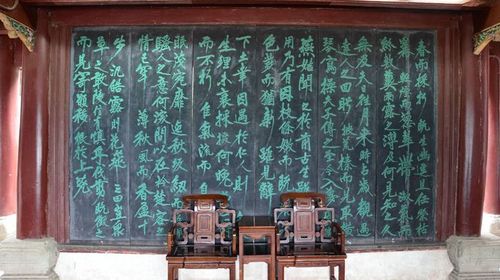 廟內(nèi)現(xiàn)存石碑和摩崖石刻及木刻書畫多達(dá)數(shù)百幅,書畫作品遠(yuǎn)自漢唐近至明清各代,名家薈萃,實(shí)為罕見。其中以木刻顏真卿書《爭(zhēng)座位帖》;石刻蘇軾作前、后《赤壁賦》大字長(zhǎng)卷;石刻岳飛書諸葛亮前、后《出師表》;黃庭堅(jiān)書《唐韓伯庸幽蘭賦》;鄭板橋書寫的詩(shī)文和竹石、蘭石繪畫等最為著名。