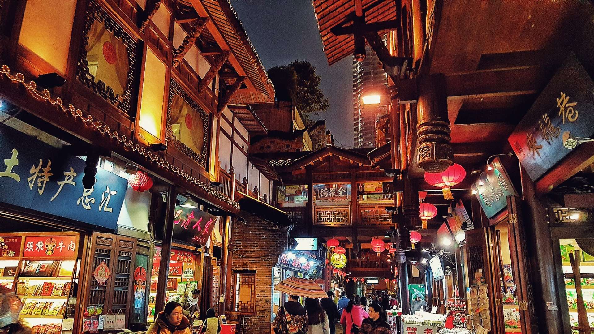 展現(xiàn)的是“另類(lèi)美食城”的景色,位于第4層,集中了中外名店。臨江一面有工匠當(dāng)街打糍粑、切桃片、烤制花生糖,以及現(xiàn)場(chǎng)演繹美食特產(chǎn)制作工藝,臨崖一面有小吃店,旦旦面、豬兒粑、大湯圓、歌樂(lè)山辣子雞、黔江雞雜,老重慶毛血旺等。