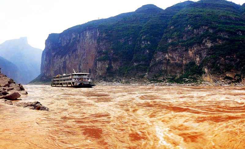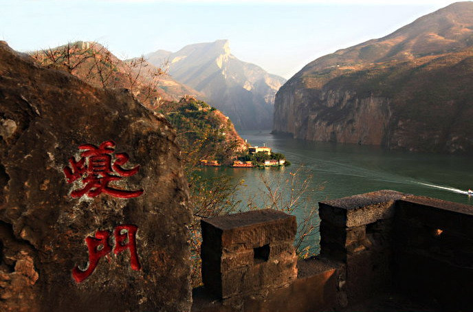 三峽的大門。西起重慶奉節(jié)縣的白帝城,東至巫山縣的大溪鎮(zhèn),全長8公里。這里河寬只有百余米,把滔滔大江緊束得像一條溝壑,而通過的流量往往多達每秒五、六萬立方米?!氨娝畷⑷f,瞿塘爭一門”,杜甫用一“爭”字,活畫出夔門的赫赫水勢。當輪船駛出瞿塘峽西口后,您走到船尾,抬眼望去,全景式的夔門雄姿便展現(xiàn)在您的面前。這時是攝影留念的最佳角度。如今,臨江的石壁上,還刻有孫元良的“夔門天下雄,艦機輕輕過。