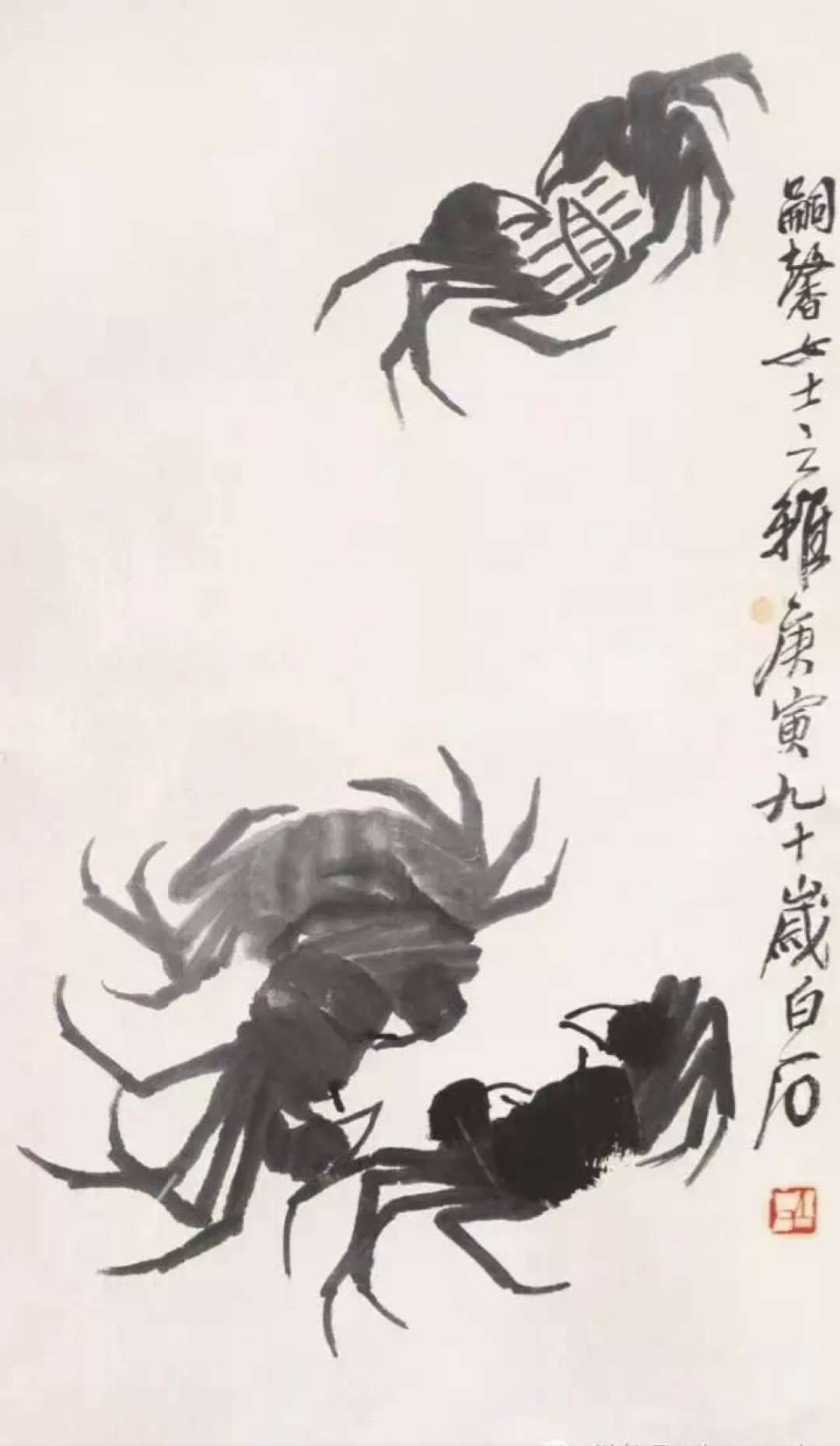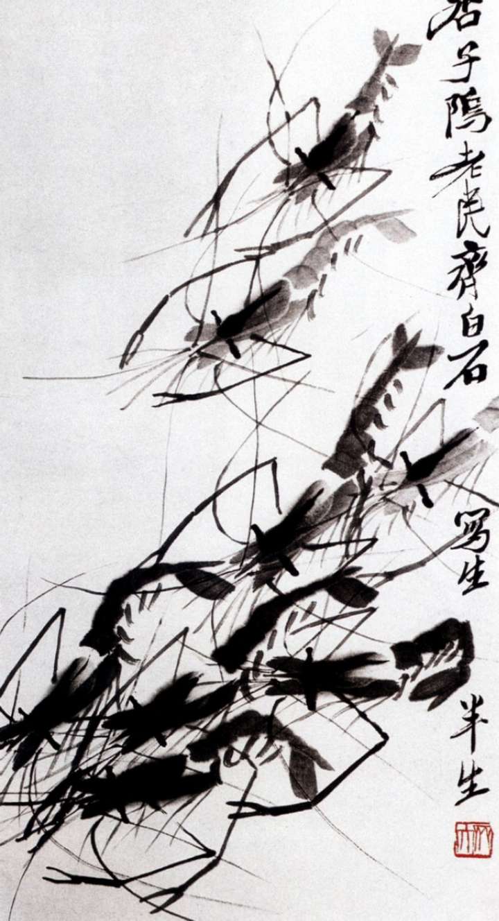 齊白石擅作花鳥蟲魚。畫的蝦更是出神入化,濕漉漉的,宛在水中,靈動活潑,神韻充盈。為了畫得逼真,他在一只大海碗里,養(yǎng)了幾只活蝦,放在案頭。作畫之前,先盯上半天,仔細觀察它們的體態(tài)、顏色、爭斗時的姿態(tài)。然后,研磨鋪紙,作起畫來,不僅把蝦的身體結構表現(xiàn)得細致入微,而且把蝦身體的彈性都表現(xiàn)得充滿力量,其長螯的勁力和觸須的柔順處理得相映生輝。蝦眼和蝦腦上的重筆,干濕用得更是恰到好處,令人叫絕。