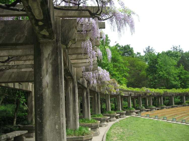 鄧演達(dá)墓位于南京中山門外靈谷寺旁,陵墓座北面南,是江蘇省文物保護(hù)單位。鄧演達(dá)墓墓園宏偉,總面積達(dá)5000余平方米。墓道人 口處為圓形花壇,墓前是一片開闊的綠草地,中間有十字型的水泥甬道將草坪對(duì)稱分割。甬道兩側(cè)列植檜柏、龍柏等常綠樹木。草地的東、西兩側(cè)建有鋼筋水泥澆鑄的花廊,花廊曲折延伸,直達(dá)陵墓前?;ɡ葍蓚?cè)遍植紫藤,花廊中還建有方亭,可供游人休憩。
