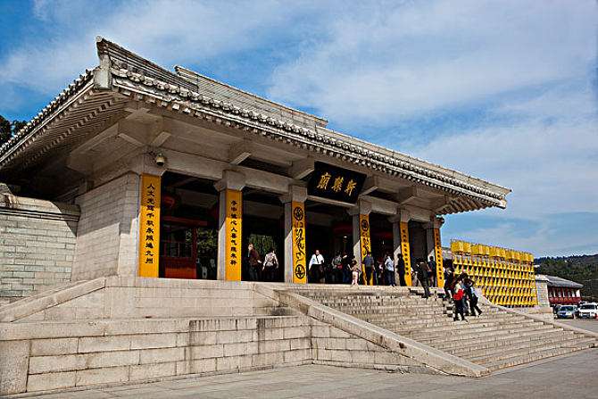 前檐當(dāng)間建有六扇隔扇門,次間、稍間則各有四扇隔扇門。檐下的闌額、平板枋為和璽彩繪、斗拱彩繪,以及兩側(cè)與兩側(cè)背面、內(nèi)梁等處彩繪,均精致華麗,絢爛無(wú)比。大殿氣勢(shì)雄偉。正殿門楣上懸掛有原國(guó)民黨愛(ài)國(guó)將領(lǐng)程潛于1938年祭陵時(shí)所題“人文初祖”四字大匾。字體鐵畫(huà)銀鉤,剛中藏秀。大殿正中木質(zhì)壁龕內(nèi)供放著一尊軒轅黃帝全身浮雕像。這尊中華民族人文始祖的浮雕像,是以東漢武梁祠的畫(huà)像石刻拓片為藍(lán)本,經(jīng)國(guó)家文物局批準(zhǔn),放大刻制而成。版權(quán)所有山東聊城聊之旅國(guó)際旅行社有限公司,轉(zhuǎn)載必究!黃帝浮雕像,石料采用陜西富平墨玉,高3.9米,寬3.3米,重11噸。石浮雕像沉穩(wěn)站立,抬臂揚(yáng)手,顯軒轅黃帝雄才大略之氣概;雕像冠帶簡(jiǎn)樸,著裝無(wú)華,顯示出遠(yuǎn)古之神韻。神龕四周的圖案為:上朱雀,下玄武,左青龍,右白虎。神龕與軒轅黃帝浮雕像都是香港同胞湛兆霖、程萬(wàn)琦于1987年清明節(jié)專程前來(lái)祭陵時(shí),捐款8萬(wàn)元人民幣制作的。殿內(nèi)兩壁原有壁畫(huà),繪軒轅黃帝一生的功德,后毀于明代。現(xiàn)大殿神龕周圍放置有花籃。神龕前供桌上有祭器、祭品等。殿外左右及背后有磚砌花墻。大殿前月臺(tái)寬21.1米,進(jìn)深10.84米,置有香爐、香案。月臺(tái)前有臺(tái)階通道三處,中間臺(tái)階正中為一圓形二龍戲珠石雕。正殿前柱子上,書(shū)有一副楹聯(lián):“祖功澤百世,宗德潤(rùn)千秋?!?/span>