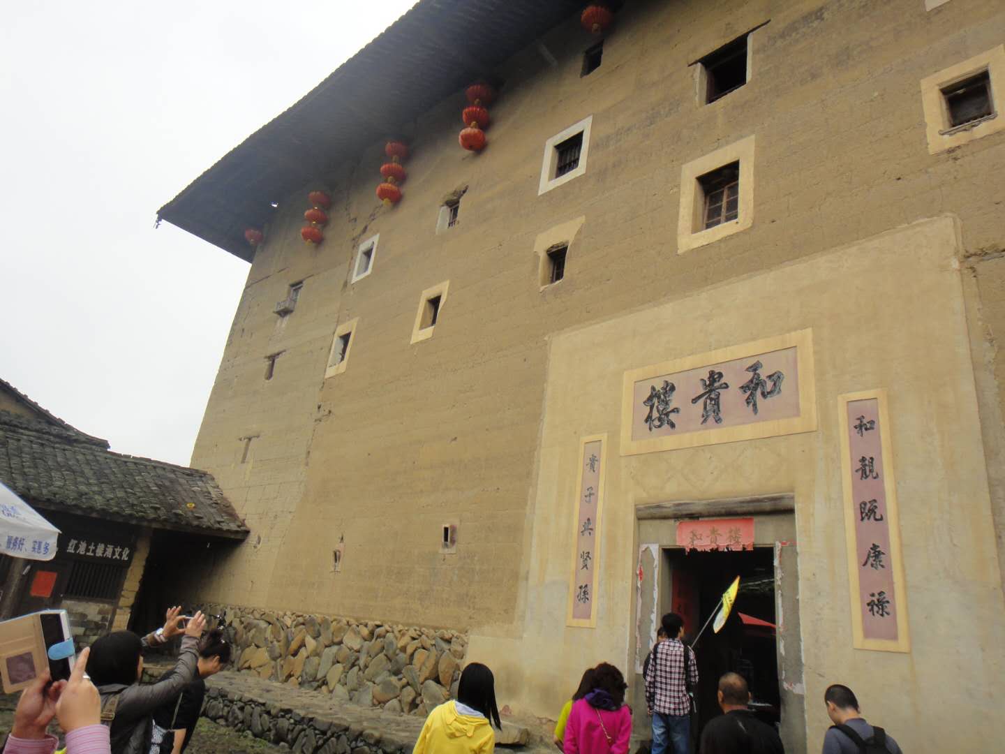 和貴樓每層有28個(gè)房間,共有140個(gè)房間。樓正中開(kāi)一個(gè)大門(mén),東西南北四方各有樓梯上下。它建于清雍正十年(1732年),據(jù)說(shuō)當(dāng)初選址建樓,開(kāi)始并未發(fā)現(xiàn)這是塊沼澤地,樓建了一層,忽然整層樓像沉船一樣,慢慢下沉到了爛地里,建樓的簡(jiǎn)姓族人無(wú)可奈何,只好在下沉的樓墻上打了100多立方米的排樁,他們覺(jué)得地基這下牢固了,就從頭開(kāi)始夯墻,建起了一座五層高的方樓。他們似乎很有把握,從不擔(dān)心大樓會(huì)傾斜或者下沉,果然兩百多年來(lái),和貴樓固若金湯,風(fēng)雨不動(dòng)安如山?,F(xiàn)在,你在樓中學(xué)堂的小天井用鐵線往地