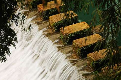 方村河伏流出露不遠(yuǎn),有一橫跨河兩岸的天然巨巖,是喀斯特是貌奇觀之一,谷稱天生橋,又謂仙人橋。高60米,厚10多米,橋孔寬20多米,河水流過橋后,還形成2米多高的大瀑布。仰觀橋孔下,只見巨型鐘乳懸掛,橋腳、橋側(cè)的裂隙石縫長出綠石草叢灌木,藤蘿花卉纏裹橋身,真是滿目琳瑯、五顏六色的天然大彩橋。橋下瀑布前水激浪涌,小船不能靠近,到此必須停船,把船扛在肩上攀登危巖,超過瀑布,又才能逆流行舟在暗河峽谷之中。此景驚險(xiǎn),別具一番樂趣。