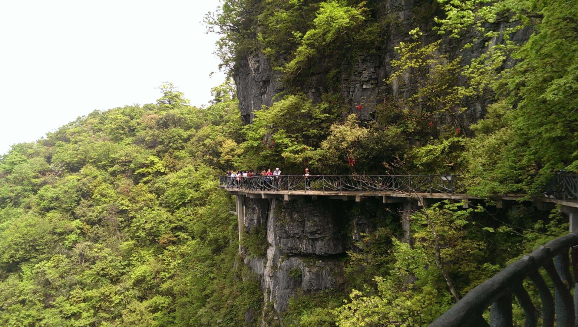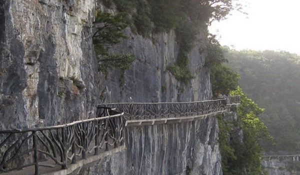 據(jù)施工人員介紹,此條棧道也是他們所修棧道中施工最難,最險峻的一條。如果您還覺得不夠刺激的話,在棧道的完結(jié)處的兩個懸崖之間有一條長160米的懸索吊橋,同時,在海拔最高點(diǎn)還有一個挑戰(zhàn)心里極限的玻璃站臺,在這里,如果你能挺直腰板伸開雙臂,那么,您就是真正的勇士了。