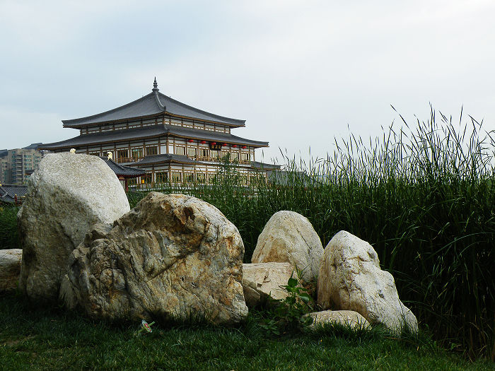 沿著唐城墻遺址走到東南角,就是曲江池遺址公園的西入口。舉目遠(yuǎn)眺,能看到湖心仙島,波光中依仙島而設(shè)的荷廊恰似一朵盛開的水蓮花。若是向更遠(yuǎn)處,能望到閱江酒樓在曲江池南岸的柳色掩映中,酒旗招展似乎要引得游人快步,而重重柳堤、香花和池水卻致人流連漫步。性急的游客,這時(shí)候也可以直接駕車取曲江池西路直接繞到公園南口進(jìn)酒樓,然而這未免饕餮了一路由北向南的盛景。