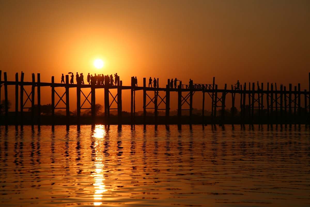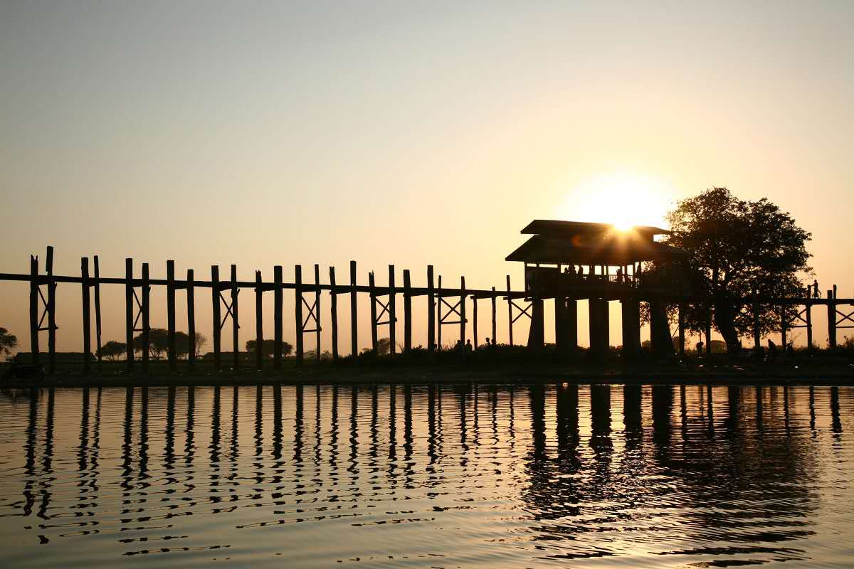 烏本橋建于1851年,長1200米,全橋完全由柚木鉚合而成,是世界上最古老和最長的柚木結(jié)構橋。橋柱與橋柱之間相距3米遠,橋柱有1000多根。整座橋相接處沒有使用一顆鐵釘,全靠斗榫。這座橋已經(jīng)歷經(jīng)150年的風風雨雨,但是依然結(jié)實。