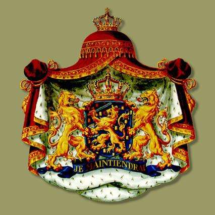 荷蘭國徽是一頂紅色貂皮懈”(Je Maintiendrai!)的藍色飾帶,兩只跨立的金獅翹著尾巴,口吐紅舌護著一面藍色盾徽。盾徽頂部是威廉一世御璽上所用的王冠;后面中央繪有一只頭戴王冠的金獅,右前肢揮舞著一把出鞘的利劍,左前肢揮動一束金色箭翎,它們象征著國王權(quán)力。華蓋如開啟的幕布,下部嵌有一條寫著威廉親王誓言“堅持不懈”。
