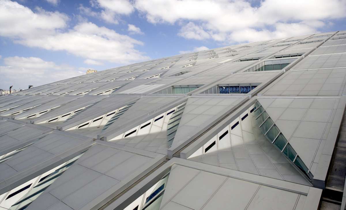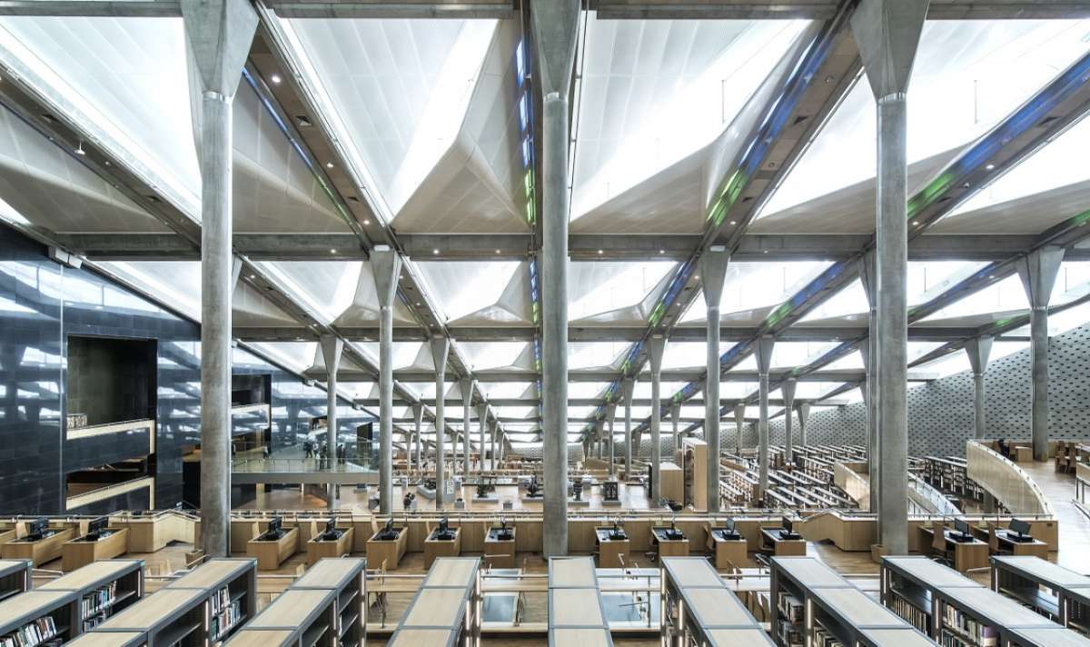 今天的圖書館達到了既現(xiàn)代又有厚重歷史感的目的。它向地中海傾斜的外部圓形建筑據(jù)稱是既懷念古時的圓形港口,又聯(lián)想到宇宙的模樣。鋼架玻璃的屋頂,和柱頂?shù)乃睦馔哥R使透入的光線彌散,且隨日光的移動而不斷變化。圖書館的墻體由2米寬1米高的巨石建成,6300平方米的石頭墻上刻滿了阿拉伯文字、圖案、符號,此外還有音樂和數(shù)學符號,以及世界各種文化的文字符號;這些圖案均系手工鑿刻而成。館內(nèi)寬敞明亮,確有傳統(tǒng)圖書館的風范。