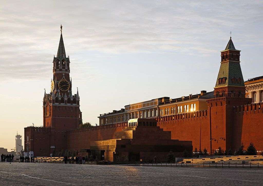 列寧墓坐落在紅場(chǎng)西側(cè),在克里姆林宮墻正中的前面。1924 年1 月27日建成,最初是木結(jié)構(gòu)的,1930 年改用花崗石和大理石建造。衛(wèi)國(guó)戰(zhàn)爭(zhēng)后,裝有列寧遺體的水晶棺重新更新了。