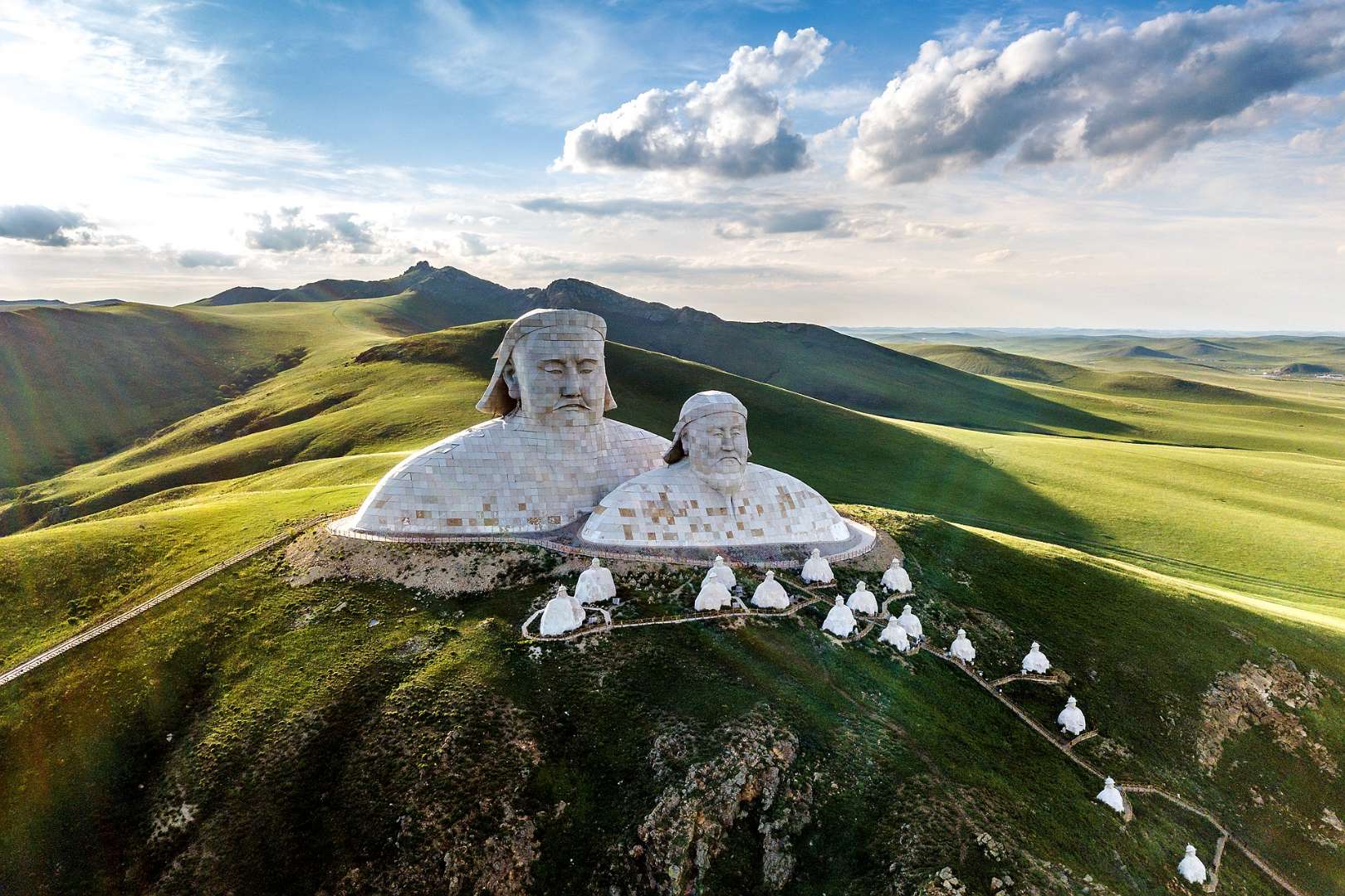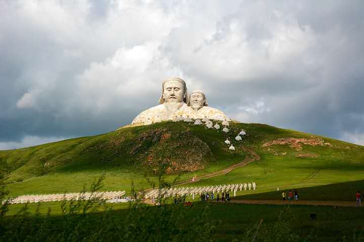 霍林郭勒市可汗山景區(qū)總投資5200萬(wàn)元,占地面積13000余平方米,景區(qū)由山門、蒼狼之路、蒙元兵陣和蒙古帝王群四部分構(gòu)成,其中成吉思汗頭像雕塑高達(dá)50米。