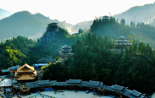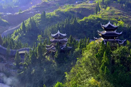 九黎宮:科學(xué)利用山水自然資源,因地制宜、依山造勢,順山而居。宮高99米,呈11開間,象征九九歸一之意。建筑由四合院到吊腳樓到?jīng)_天樓三合為一,九黎宮內(nèi)有苗族接龍?zhí)?、曬樓虎口堂、四合院、八字朝門和吊腳樓群等多種文化符號(hào),是彭水展示苗族文化、民風(fēng)民俗的博物館,是目前最大的吊腳樓群。