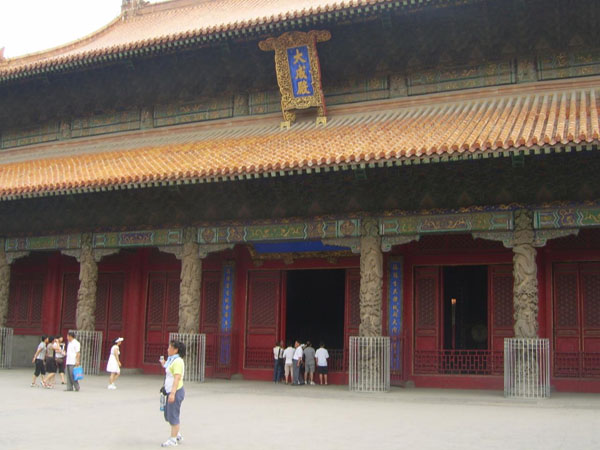 洙水橋北,先是一座綠瓦三楹的高臺(tái)大門——擋墓門,后面就到了供奉孔子木主的享殿。去享殿的甬道旁,有四對(duì)石雕,名曰華表、文豹、角端、翁仲。華表系墓前的石柱,又稱望柱;文豹,形象似豹,腋下噴火,溫順善良,用以守墓;角端,也是一種想象的怪獸,傳說日行1萬(wàn)8千里,通四方語(yǔ)言,明外方幽遠(yuǎn)之事;翁仲,石人像,傳為秦代驍將,威震邊塞,后為對(duì)稱,雕文、武兩像,均稱翁仲,用以守墓。兩對(duì)石獸為宋宣和年間所刻,翁仲是清雍正年間刻制的,文者執(zhí)笏,武者按劍。甬道正面是享殿,殿廣5間,黃瓦 歇山頂,前后廊式木架,檐下用重昂五踩斗栱。殿內(nèi)現(xiàn)存清帝弘歷手書“謁孔林酹酒碑”,中有“教澤垂千古,泰山終未頹”等詩(shī)句。解放戰(zhàn)爭(zhēng)時(shí),朱德總司令曾在此殿內(nèi)召開過軍事會(huì)議。