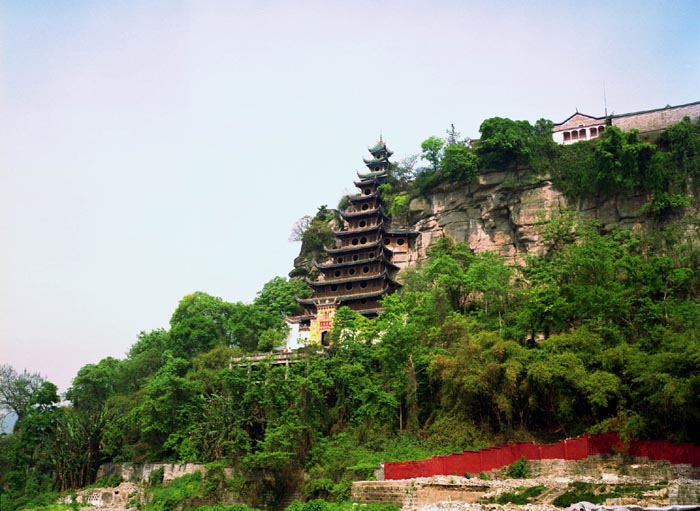 石寶寨是一座拔地而起四壁如削的孤峰 清乾隆初年,借助架于石壁上的鐵索在山頂修建了一座寺廟,嘉慶年間又聘請(qǐng)能工巧匠研究如何取代鐵索上山,于是便依山取勢(shì)修建這座九層樓閣 從此,香客及游人可免攀援鐵索之苦,上樓直達(dá)山頂,1956年又加以修建改為12層,如今這里已成為游客眺望長(zhǎng)江景色的"小蓬萊"了。