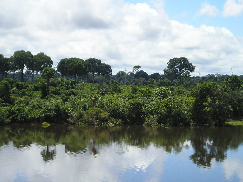 亞馬遜河中游流經(jīng)秘魯、哥倫比亞、巴西、全長(zhǎng)約為2200千米。在巴西北部,亞馬遜河水深45米,河寬3000米,流速緩慢;河中島洲錯(cuò)列、河道呈網(wǎng)狀分布,兩岸河漫灘寬30~100千米,地勢(shì)低下,湖沿密布,排水不暢;河流兩側(cè)支流眾多,都發(fā)源于安第斯山東坡,呈羽狀分布。至中游末端,河寬至11千米,河深99米。