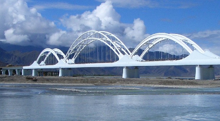 拉薩河特大橋是青藏鐵路的標(biāo)志性工程,全長(zhǎng)928.85米,最大跨度為108米 ,主橋采用五跨連續(xù)橋梁和中間三跨連續(xù)鋼拱組合體系,主跨采用雙層彎拱結(jié)構(gòu),這兩項(xiàng)均為國(guó)內(nèi)首次使用,在同類橋梁中處于世界領(lǐng)先、亞洲第一的地位。該橋的主橋橋墩設(shè)計(jì)為牦牛腿式變截面雙圓柱墩,引橋橋墩設(shè)計(jì)為雪蓮花式變截面圓端形墩。大橋設(shè)計(jì)結(jié)構(gòu)新穎,融民族特色與現(xiàn)代風(fēng)格于一體,建成后大橋通體白色,連續(xù)的拱形猶如一條飛揚(yáng)的哈達(dá)與金色的布達(dá)拉宮遙遙相望。
