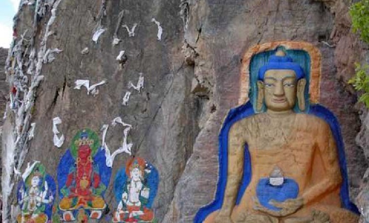 度母神廟往東不遠(yuǎn),有著名的摩崖石刻聶當(dāng)大佛,這是中外觀光者進(jìn)入拉薩前的一大景觀,幾乎所有的人都要下車瞻仰度母神廟,并在聶當(dāng)大佛前留影。