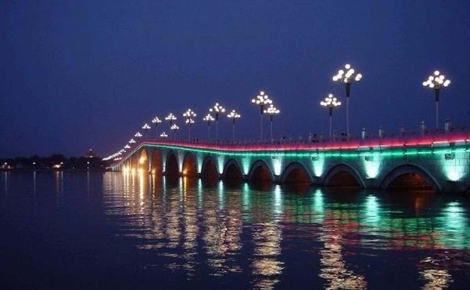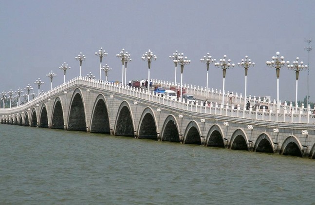 東昌大橋位于聊城古城西首,橫跨東昌湖東西兩岸。2001年6月動工修建,2003年落成。古時,人們是由吊橋進入古城區(qū),現在連接古城和新城的紐帶就是橫跨在東昌湖上的四座關橋了。東昌大橋是在原西吊橋的原址部位上修建起來的,它是我市城區(qū)投資最多,規(guī)模最大的橋梁。東昌大橋全長322米,橋面凈寬15米。上部結構為石砌拱橋,共21孔,象征著跨入21世紀,所以又稱世紀拱橋。版權所有山東聊城聊之旅國際旅行社有限公司,轉載必究!中間5孔為懸鏈線拱,兩側為圓弧拱。主孔通航凈高9米,可供大型游船順利通過。拱圈、橋身采用花崗巖嵌面,橋面青石鋪砌,橋上筑有優(yōu)質漢白玉攔板266塊,漢白玉欄桿上雕刻著《水滸》人物故事圖案,漫步東昌大橋一個來回,就如同看了一遍《水滸傳》。被譽為“中國江北最大內陸湖泊石拱橋”,堪稱橋梁精品,為美麗的東昌湖增添了一道亮麗的景色。