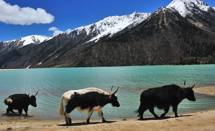 位于318國道線八宿境內(nèi)的然烏湖是雅魯藏布江支流帕隆藏布江主要源頭,湖面海拔3807多米,長約26公里,平均寬1至5公里。然烏湖北面有著名的拉古冰川,冰川延伸到湖邊。每當(dāng)冰雪融化時(shí),雪水便注入湖中,使然烏湖經(jīng)常保有豐富的水源。然烏湖邊是綠草茵茵的草場(chǎng)和綠油油的莊稼;湖邊山腰上則是莽莽的森林,再往上是五顏六色的杜鵑花和灌木叢林帶;山頂則是終年不化、重疊起伏的雪山。