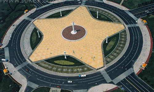 從廣場(chǎng)中央大道中心點(diǎn)往北500米是會(huì)展中心;往南是百年城雕廣場(chǎng),500米外是藍(lán)色的大海。中央大道紅磚鋪地,兩側(cè)綠草如茵,每隔20米設(shè)一個(gè)航標(biāo)燈造型的石柱燈,象征著中國(guó)正面向大海,走向世界。
