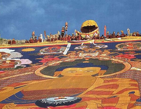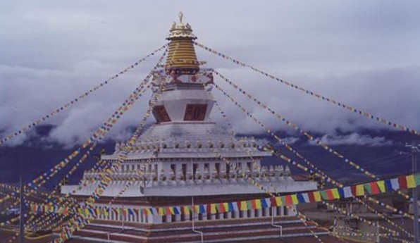 雍仲林寺的重要殿堂通追拉康,位于寺院東北側(cè)。通,意為“見”;追,意為“解脫”。顧名思想朝圣者來到這時,僧人們就會主動給你敬圣水。拉康面積約80平方米,殿內(nèi)供奉的5座靈塔,“文革”時全部被毀,現(xiàn)已將其中最大的江袞•達(dá)哇堅贊塔修復(fù),高達(dá)5米,鑲嵌黃金2公斤。殿內(nèi)一對銀燈和一個曼荼羅,各用70個銀元制成。殿內(nèi)繪有壁畫:中央壁上繪有江袞•達(dá)哇堅贊畫像;四壁繪有苯教祖師頓巴辛饒的千佛像。