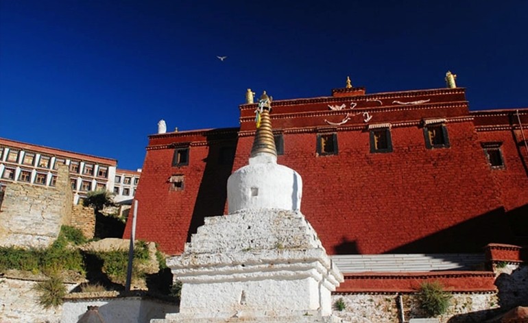 寺院西北側(cè)為竹康(修行殿),面積40多平方米。主要供奉護(hù)法神和一座達(dá)哇堅贊贊銅鍍金小靈塔,塔內(nèi)珍藏著達(dá)哇堅贊的手、足及其使用過的法器。
