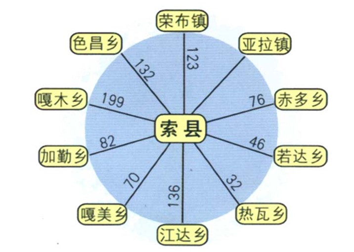2002年,索縣由1區(qū),1鎮(zhèn)11鄉(xiāng),141村委會(huì)調(diào)整為2鎮(zhèn)、8鄉(xiāng),6居委會(huì)、135村委會(huì):亞拉鎮(zhèn)、榮布鎮(zhèn)、若達(dá)鄉(xiāng)、熱瓦鄉(xiāng)、赤多鄉(xiāng)、嘎美鄉(xiāng)、加勤鄉(xiāng)、江達(dá)鄉(xiāng)、色昌鄉(xiāng)、嘎木鄉(xiāng)。