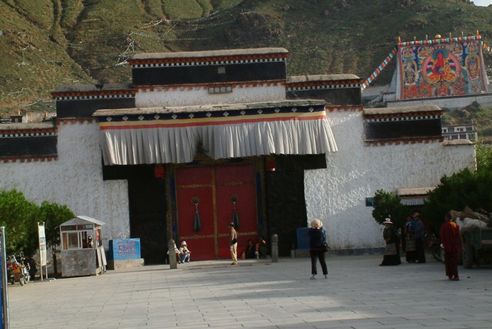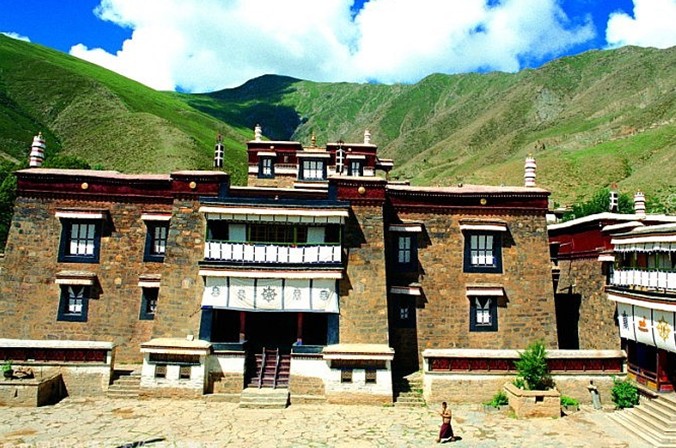 寺院坐西朝東,四面群山環(huán)抱,山清水秀,環(huán)境十分優(yōu)美。面積約10萬余平方米,圍墻為多邊形。寺內主要建筑為祖拉康佛殿,坐西向東,高三層。底層為大經堂,面闊5間,進深6間,內有20根方柱,其中有兩根高5.5米的林柱通向二層。