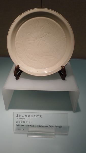 瓷器展廳中展出了北京作為都城歷史時期出土和傳世的瓷器170組件,青花釉里紅海水云龍紋天球瓶在2000年就已價值1000萬元。另外宋遼金時期的定窯白釉童子誦經壺、元大都出土的青花鳳首扁壺、乾隆松石綠地粉彩蕃蓮紋多穆壺等名貴瓷器都是難得一見的稀世精品。展廳中還列有明成化斗彩葡萄紋杯,這對葡萄紋杯與雞缸杯為同時期作品,都是明代官窯的代表作,而雞缸杯只有一只,葡萄紋杯是一對,這對杯子是在清初重臣索尼7歲孫女的墓中出土的。