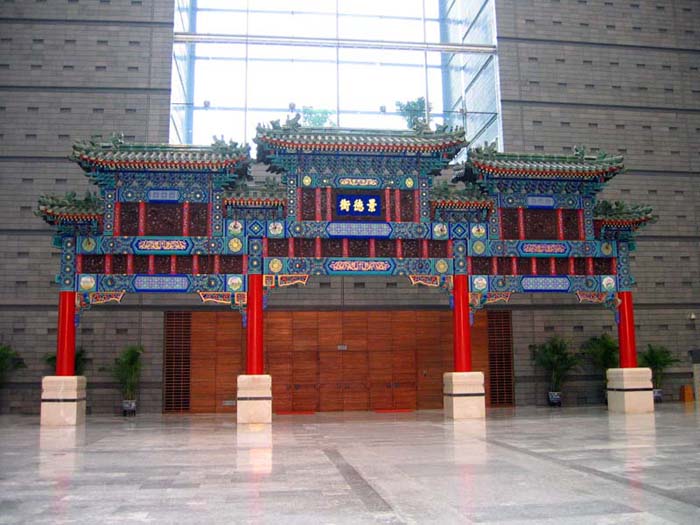 首都博物館新館建筑內部分為三棟獨立的建筑,即:矩形展館,橢圓形專題展館,條形的辦公科研樓。三者之間的空間則為中央大廳和室內竹林庭院。自然光的利用、古樸的中式牌樓、下沉式的翠竹庭院、潺潺的流水,為觀眾營造了一個兼具人文、自然情調的環(huán)境。新館的展覽陳列以首都博物館歷年收藏和北京地區(qū)的出土文物為基本素材,吸收北京歷史、文物、考古及相關學科的最新研究成果,借鑒國內外博物館的成功經驗,形成獨具北京特色的現(xiàn)代化展陳。