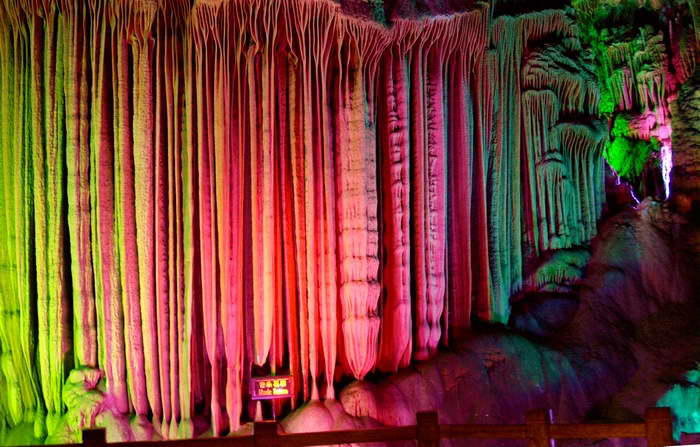 進入景區(qū),似步入世外桃源,群山環(huán)抱,碧水潺潺,楊柳婀娜,桃花滿園。古寨依山而座,炊煙裊裊,雞犬相聞,淳樸的鄉(xiāng)風讓人迷醉,飲一碗地道的油茶,品一杯香醇的水酒,傾聽關于銀子巖的神秘傳說,讓人忘卻紅塵,不忍歸去。走進銀子巖,如水般的清涼和平靜撲面而來;明白了栩栩如生、惟妙惟肖、巧奪天工。贊嘆、驚訝、緊張,銀子巖的鐘乳石奇形怪狀,在各色燈光的照射下,一條條石筍上就像綴滿了銀粉,白的像一塊塊玉石,紅的似一簇簇珊瑚,綠的若一片片翡翠,黃的如一顆顆琥珀。燈光與天然的石筍融為一體,好一個人間仙境。穿行在銀光四射、熠熠生輝的石府中,游客會深刻地領悟到銀子巖三個字的由來。巖洞有老中青幼四種不同年紀的石鐘乳,老的色澤蒼黃,中青年的則白里透黃,色澤明艷,幼年則銀白如玉。銀子巖地貌奇特,有偉岸的音樂石屏,彈指有聲,聲如天籟;有繽紛的林海雪原,寬闊遼遠,不知其源頭;地面的沖積巖酷似萬里長城,蜿蜒起伏在洞穴之中;巖頂?shù)墓质跓艄獾妮x映下,有的巨大的豎琴排列齊整,有的像南天一柱的定海神針,有的如獅虎猛獸,有的像入定高僧,有的似域外仙人,奇美景象應接不暇。宛如漫步在廣寒宮,幻象不斷。