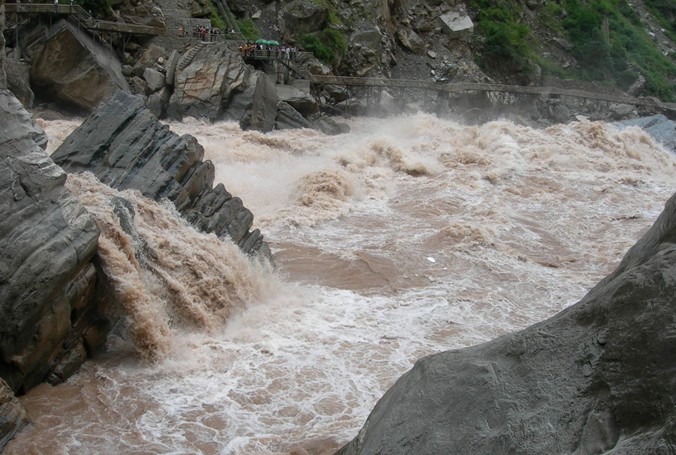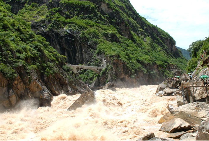 石鼓以下,江面漸窄,至左岸支流碩多崗河口橋頭鎮(zhèn),往東北不遠(yuǎn)即進(jìn)入舉世罕見的虎跳峽?;⑻鴯{上峽口與下峽口相距僅16公里,落差竟達(dá)220米。平均坡降達(dá)13.8‰,是金沙江落差最集中的河段。峽中水面寬處60米,窄處僅30米并有巨石兀立江中,相傳曾有猛虎在此躍江而過,故名虎跳石,虎跳峽也由此得名。峽內(nèi)急流飛瀉、驚濤轟鳴,最大流速達(dá)10米/秒。峽谷右岸為海拔5596米的玉龍雪山,左岸為海拔5396米的哈巴雪山,兩山終年積雪不化。峽內(nèi)江面不足海拔1800米,峰谷間高差達(dá)3000余米。峽中谷坡陡峭,懸崖壁立,呈幼年期“V”型峽谷地貌。