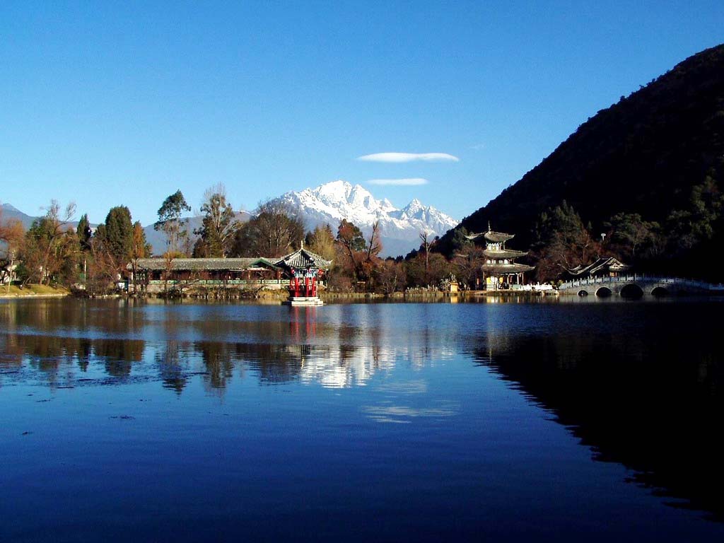 黑龍?zhí)豆珗@位于昆明北郊的龍泉山五老峰下,(亦稱龍泉山麓,太極山、五老山), 昆明黑龍?zhí)墩嫉孛娣e91.4公頃,距離市區(qū)約17公里。這里古木參天,泉壑幽邃,修竹茂林,潭深水碧,景色幽深。民間傳說有黑龍王潛藏于此,故稱黑龍?zhí)兑喾Q龍泉山麓,距離市區(qū)約17公里。黑龍?zhí)秲?nèi)有罕見的大型梅園,是昆明的賞梅勝地,稱為“龍泉探梅”。園內(nèi)的“唐梅”相傳由南詔移植過來,同安寧漕溪寺的“元梅”被認為是云南最珍貴的古梅。在黑龍?zhí)秲?nèi)還有這樣的奇怪現(xiàn)象,潭以中間的石橋為界一分為二,一清一濁,清濁之水互不相融,據(jù)說連魚兒都互不過界,頗為神奇。黑龍?zhí)妒怯忻牡澜虅俚兀譃樯舷聝捎^,從漢代的黑水祠演變而來。上觀始建于唐宋時期,始稱龍泉觀,下觀始建于明代,俗稱黑水宮。1997年,黑龍?zhí)队斡[區(qū)占地3.6公頃。1999年,黑龍?zhí)队酗L景林51.4公頃,植有各種喬灌木12萬多株。梅園28.5公頃,地栽梅5794株,盆栽梅1725盆。庭園占地6.9公頃,有喬木3973株,灌木48660株,修竹306叢。 1978年建苗圃,占地5.6公頃。建有杜鵑谷,植各種杜鵑10萬多株。1998年又新辟一期綠化工程,占地33公頃,游覽區(qū)擴大到45.4公頃。園內(nèi)有昆明市綠化委員會掛牌保護的古樹名木18株,是昆明市存有古樹名木最多的風景名勝區(qū)。麗江黑龍?zhí)妒冀ㄓ谇《辏?737),其后乾隆六十年、光緒十八年均有重修記載。舊名玉泉龍王廟,因獲清嘉慶、光緒兩朝皇帝敕封“龍神”而得名,后改稱黑龍?zhí)丁T娫疲?ldquo;泉渙渙兮漣漪,問何時最是可人?須領(lǐng)略月到天心,風來水面;亭標標而矗立,看這般無窮深致,應(yīng)記取云飛畫棟,雨卷珠簾。”黑龍?zhí)兑云涮焐愘|(zhì),名列《中國名泉》、《中國風景名勝》等書,誠不虛也。迎面見有一座涂金繪彩的牌樓,門口四尊石獅,肌理秀美,威武雄壯,過去守護木氏土司衙門,1966年遷此守護玉泉。進門往右,但見垂柳飄指,一潭澄碧,樹底天光云影,樹梢樓臺隱現(xiàn)。沿潭右堤至鎖翠橋,橋上古人有聯(lián)云:“驚濤撼樹飛晴雪,未雨垂虹臥曲波。”它生動地描繪了橋邊景致。右邊橋下三孔飛瀑,水花四濺,上觀景區(qū)濤聲如雷,流向古城,玉水河畔,楊柳依依,濃蔭蔽日。往橋的左邊看,一座五孔石拱橋,長虹臥波一般,將潭一分為二,玲瓏俊美的一文亭、得月樓分別屹立內(nèi)外潭心,四面臨水,有橋與岸上相連。此樓始建于清光緒二年(1876年),樓名取自古人對聯(lián)“近水樓臺先得月、向陽花木早逢春”中三字。1963年重建時,郭沫若為該樓題寫了匾額“得月樓”三字及兩[1]副對聯(lián)。一副是集毛澤東詩詞句:春風楊柳萬千條,風景這邊獨好;飛起玉龍三百萬,江山如此多嬌。另一副是郭老撰書的楹聯(lián):龍?zhí)兜褂呈?,潛龍在天,飛龍在地;玉水縱橫半里許,墨玉為體,蒼玉為神。全聯(lián)僅三十字,卻寫出了麗江黑龍?zhí)兜纳耥崳瑫ㄥ賱哦鵀⒚摫挤?,為公園增色不少。遠處玉龍雪山倒遇潭中,可見“雪山四萬八千丈,銀屏一角深插底”奇景。象山半壁也映入水中,使黑龍?zhí)渡街杏兴杏猩?,山水相映,景色無比秀麗。