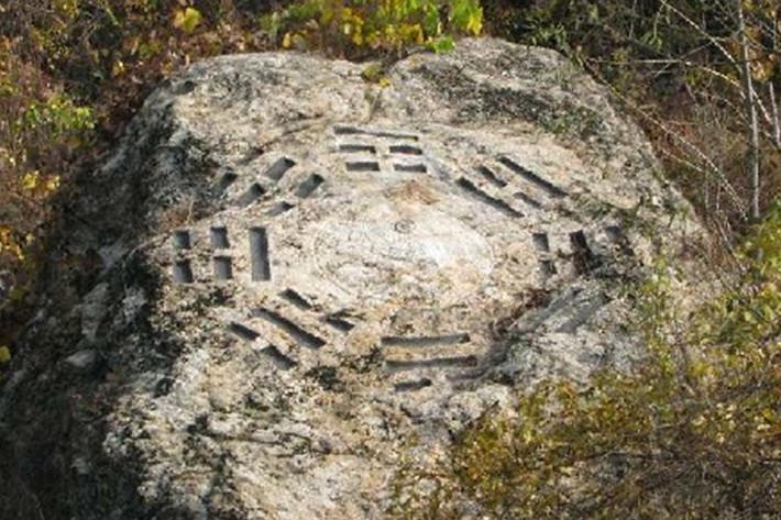 與石花頂隔溝對峙,山城有古城遺跡?,F(xiàn)存有人工鑿刻的石椅、石旗桿、定向盤等。石椅坐南朝北,下臨深淵,兩側(cè)有平臺,近處三個山峰上各有一小石椅。