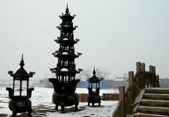 原四寺都有殿堂,據(jù)《盛京通志》卷九十七記載:永光寺原有大殿五楹,碑亭二座、天王殿三楹、鐘鼓樓二座、山門三楹。寺東寶塔一座,禪堂僧房二十四間。延壽寺原有大殿五楹、經(jīng)堂三楹、碑亭二座、天王殿三楹、鐘鼓樓二座、寺西寶塔一座、山門三楹、晾經(jīng)樓一楹、禪堂僧房三十間。廣慈寺原有大殿五楹、碑亭二座、天王殿三楹,鐘鼓樓二座、寺南塔一座、山門三楹……?,F(xiàn)在四寺的殿堂,除法輪寺保留大殿五楹,天王殿三楹,東西配殿各五楹,寺北寶塔一座,山門三楹外,其它各寺的建筑均已無存。四塔的建造形式,均為藏式喇嘛塔,是由基座、塔身、相輪三部分構(gòu)成?;鶠榉叫问殢涀猩舷驴?,在四角和每面中間立有兩根石柱,從而每面構(gòu)成三個(gè)壸門。石柱上都雕有寶相花、西蕃蓮等紋飾。每面中間壸門置磚雕寶盆和火焰,左右壸門都有高大凸起的磚雕雄獅?;峡蛑嫌制鹑龑哟u砌圓壇座。上面即是寶瓶式塔身塔身的南面辟有佛龕內(nèi)供神牌,佛龕周圍嵌流麗的云珠。塔身之上為十三層相輪,再上為塔剎,版權(quán)所有山東聊城聊之旅國(guó)際旅行社有限公司,轉(zhuǎn)載必究!由銅鑄仰伏寶蓋、日、月、寶珠組成。寶蓋之下懸風(fēng)鐸。西塔因年久失修,已殘破不堪,于1968年拆除。西塔塔身內(nèi)出有五谷、松柏樹枝、香泥小塔、金銀塊和金珠、琥珀珠、瑪瑙珠、寶石珠等,還有多種文字的經(jīng)卷。在地宮中出土了銅質(zhì)鎏金天地佛(系密宗大威德金剛),天佛是一頭四面,頭戴王冠,頭上還有一立佛,十二只手臂,手中握有降魔杵,捆仙索,照妖鏡等法器。地佛與天佛相擁,手中也握有法器。天地佛身下懸有許多人頭,腳下踩著一仰一伏的兩個(gè)魔身。地宮中還出有塔式小銀盒,盒內(nèi)裝一小葫蘆,玉匜。在一景泰蘭盤內(nèi)裝有琥珀珠、碧璽珠、藍(lán)色料珠、綠松石,紅寶石、藍(lán)寶石,孔雀石,是為七寶,還有果品等。當(dāng)為天地佛供養(yǎng)之物。