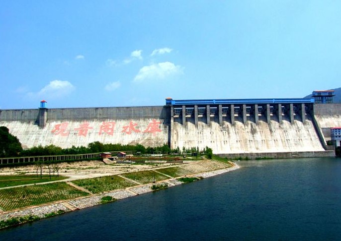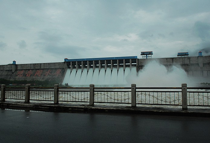 觀音閣水庫是一座以防洪、供水為主,兼有灌溉、發(fā)電、養(yǎng)魚等綜合利用的大型水利樞紐工程。主體工程1990年5月開工,1994年落閘蓄水,2000年11月竣工。工程總投資23.19億元??刂屏饔蛎娣e2795平方千米 。工程為Ⅰ等工程,主要建筑物為1級(jí)建筑物,按千年一遇洪水設(shè)計(jì),萬年一遇洪水校核,總庫容21.68億立方米。攔河壩為碾壓混凝土重力壩,共分65個(gè)壩段,由攔河壩段、溢流壩段、底孔壩段和電站壩段組成,最大壩高82 米,壩頂長1040 米,寬10 米。