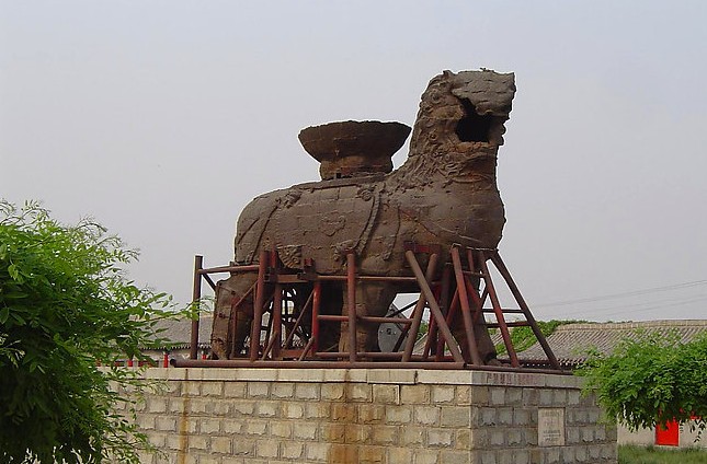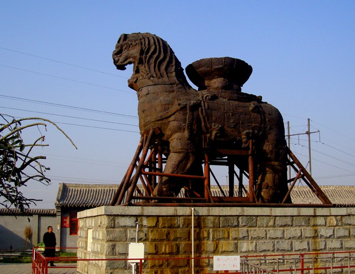 河北滄州鐵獅子鑄于后周廣順三年(公元953年),距今已有一千多年的歷史,采用“泥范明澆法”鑄成,具有較高的歷史科學(xué)和藝術(shù)價值,為全國重點文物保護(hù)單位。通寬5.35米,身長6.30米,身高6.6米,體寬3.0米,重約40噸,素有“獅子王”的美譽,一千多年來,它飽經(jīng)滄桑,在古滄州,它曾被當(dāng)成神物供奉,享盡了香火;在烽火連天、哀鴻遍野的戰(zhàn)亂年代,又經(jīng)受了刀戈的砍殺,在獅體內(nèi)外斑痕累累。