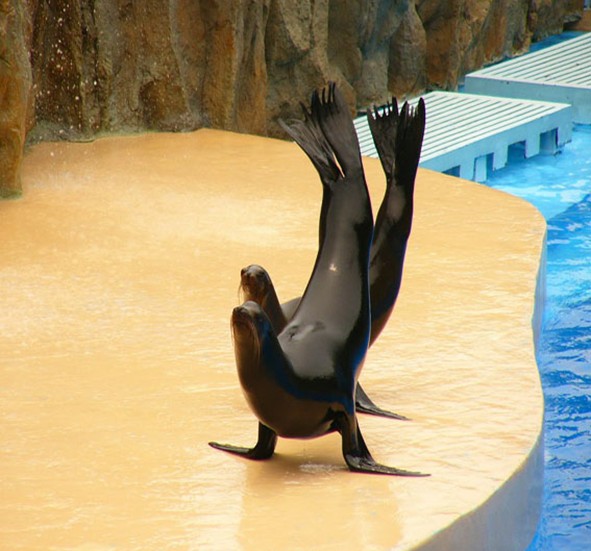 1997年5月從烏拉圭引進的4頭南美海獅(分別起名為“歡歡”、“樂樂”、“海海”、“琴琴”)更是非常聰明、可愛,是海獸表演家庭的幽默大師,別看它們其貌不揚,可在馴養(yǎng)師的嚴(yán)格訓(xùn)練下,也能表演“握手”、親吻、問候、套圈、學(xué)人走路、鼓掌、再見、翻滾以及高難度的“頂球”、“單手倒立”、“一獅兩球”、《海獅學(xué)?!返冉?0余個精彩節(jié)目,其幽默滑稽的表演,令觀眾捧腹大笑。