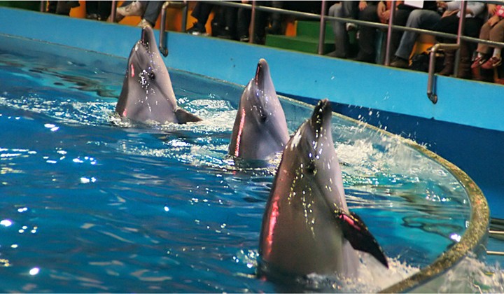 館內(nèi)所馴養(yǎng)的海獸有6頭北太平洋寬吻海豚;4頭南海獅、4頭加州海獅;3頭斑海豹;40余個品種2000余尾熱帶魚等供游客觀賞。其中6頭海豚聰明、溫順、敏捷,每頭體重250-300公斤不等,身長2.5--3.0米左右。每天每頭需吃魚25-30公斤。在馴養(yǎng)師的引導(dǎo)下,能夠表演:唱歌、跳舞、轉(zhuǎn)呼拉圈、雙豚抱球、高空頂彩球、“浪漫騎士”、“飛旋舞步”等20多個新奇精彩的節(jié)目。